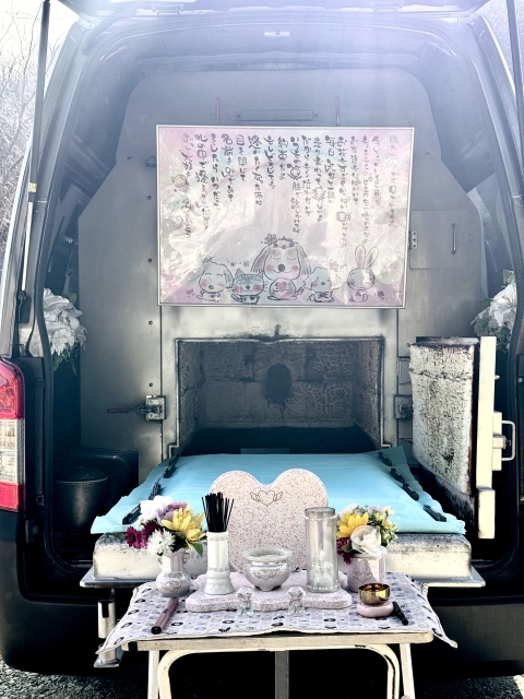 旅立ちの前には、お花やオヤツ、そしてお気に入りのお洋服やリボンを添えていただきました。優しく撫でながら過ごす最後のひとときは、あたたかな愛情に満ちた大切な時間でした。